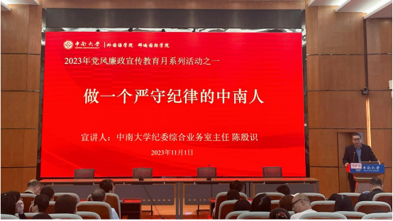 yl9193永利集团纪委综合业务室主任陈殷识以“做一个严守纪律的中南人”为题开展2023年党风廉政宣传教育,将理论知识与典型案例相结合,带领全体教职工强化知条规、懂纪律、慎言行的廉政意识。陈殷识强调党员须遵守政治纪律、群众纪律、组织纪律、工作纪律、廉洁纪律、生活纪律,以各高校负面案例为鉴,以先锋模范为榜样,用实际行动维护党的形象与威望,永葆共产党员的纯洁性。