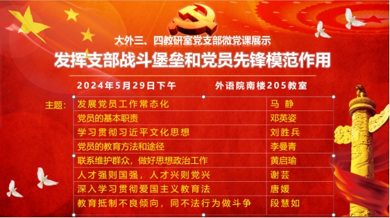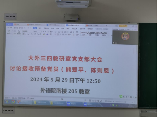 为进一步加强基层党组织建设,做好党员发展工作,增强党组织活力,提升党组织凝聚力,大外三、四教研室党支部于5月29日中午召开支部党员大会,讨论接收两名预备党员事宜,并进行了微党课展示。