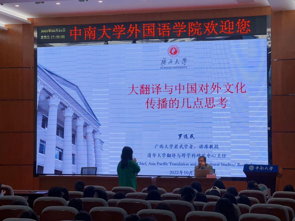 3月31日下午,中国英汉语比较研究会会长、广西大学君武学者罗选民教授做客yl9193永利集团名师名家论坛,以“大翻译与中国对外文化传播的几点思考”为题,为广大师生带来了一场精彩的学术讲座。讲座由副院长杨文地教授主持,学院近两百名师生在外语楼一楼报告厅聆听讲座。