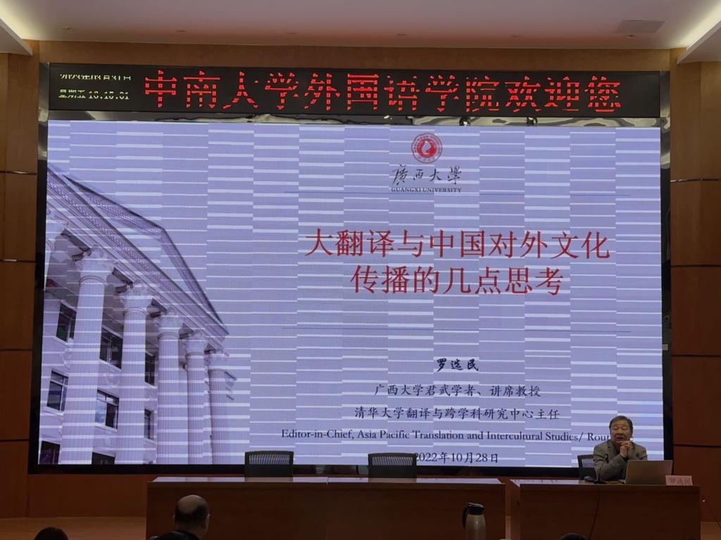 罗选民教授以“莎士比亚逝世400周年纪念活动”、“塞万提斯逝世400周年纪念活动”以及“汤显祖逝世400周年纪念活动”对比为切入点,发现同样是400周年纪念活动,汤显祖与莎士比亚相比国际影响力有着巨大差异,其原因在于《哈姆雷特》等作品被不断翻译和演绎,同时还不断涌现各种以其为原型改编的影视作品,但《牡丹亭》至今仍停留在文本和单一的戏曲舞台形式,导致汤显祖的作品没有像莎士比亚作品那样构建起世界性的集体文化记忆。罗教授阐述了文化记忆的概念,即社会群体通过一系列符号象征、媒体传播、机构运作和社会实践等方式反复运用,从而构建的具有传播功效并为成员间共享的过往记忆。他指出个体文化记忆、集体文化记忆与世界文学经典之间存在着密切关系,即个体文化记忆组成集体文化记忆,集体文化记忆影响个体文化记忆;集体文化记忆催生世界文学经典,世界文学经典影响并加深集体文化记忆。同时罗教授举出了若干从个人记忆到集体记忆再到文艺作品的关联性经典案例,包括二战集中营记忆、南京大屠杀记忆和西南联大记忆等。随后,罗教授分别从莎士比亚作品的文学改写与《鲁拜集》的跨界翻译两个案例,说明了文学作品的改编和传播属于经典作品的“投胎转世”,往往能够产生新的魅力,甚至有比原作更好的命运。最后,罗教授结合自身的学术生涯,指明了大翻译与中国文化传播需要做好的四件事情,即要做好历史钩沉,用大翻译讲好中国故事;要践行理论创新,创造中国制造的理论话语;要促进话语主导,提升国际学术的显性参与;要增强国际传播,让中国故事响彻全球。在结语部分,罗教授指出过去中国的翻译活动基本上停留在个体文化记忆上,在异文化传播方面没有形成“产业链”,我们在国际话语权方面影响力和展示还不够;未来我们必须注重大翻译,建立中国文学和文化的集体文化记忆,中国才能在建立人类命运共同体方面发挥积极和重要作用。