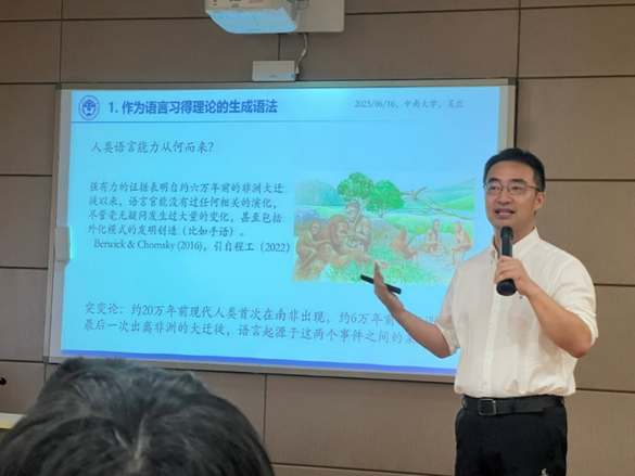 2023616日晚19点,我院湘江语言学论坛在501会议室成功举行,广东外语外贸大学英文学院副院长、广东外国语言学会副会长吴庄教授应邀作题为 “生成语法视角的语言输入观及其流变”的学术讲座。苏怡教授主持讲座。