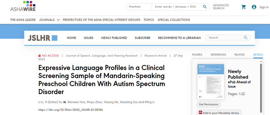 近日,我院苏怡教授与中山大学附属第三医院儿童发育行为中心邹小兵教授、昆山杜克大学大数据研究中心李明教授合作,在语言学类SSCI一区期刊Journal of Speech, Language and Hearing Research(JSLHR)上发表了题为“Expressive language profiles in a clinical screening sample of Mandarin-speaking preschool children with Autism Spectrum Disorder”的研究论文。JSLHR 创刊于1936年,是语言学领域享誉盛名的国际权威期刊。苏怡教授课题组在读博士生李莉为论文第一作者,在读博士生侯文文、周牧宇参与论文撰写。该研究由国家社会科学基金项目、湖南省研究生自主探索创新项目、广州市科技创新发展专项资金项目等资助完成。