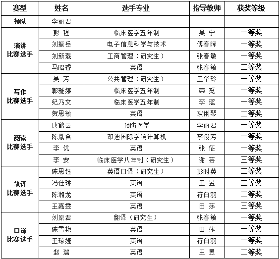 此次大赛吸引了全省四十多所高校约600名选手参加,由20人组成的yl9193永利集团团队共获得一等奖12个、二等奖6个和三等奖2个。其中,演讲、口译和阅读组的第一名和第三名均为我校学生。我校团队在演讲、写作和阅读三项传统赛事中全都刷新历史最好成绩,在新增项目口译比赛中也是战果辉煌。吴宁老师指导的演讲组第一名获得者彭程同学受邀代表参赛选手在闭幕式上发言。