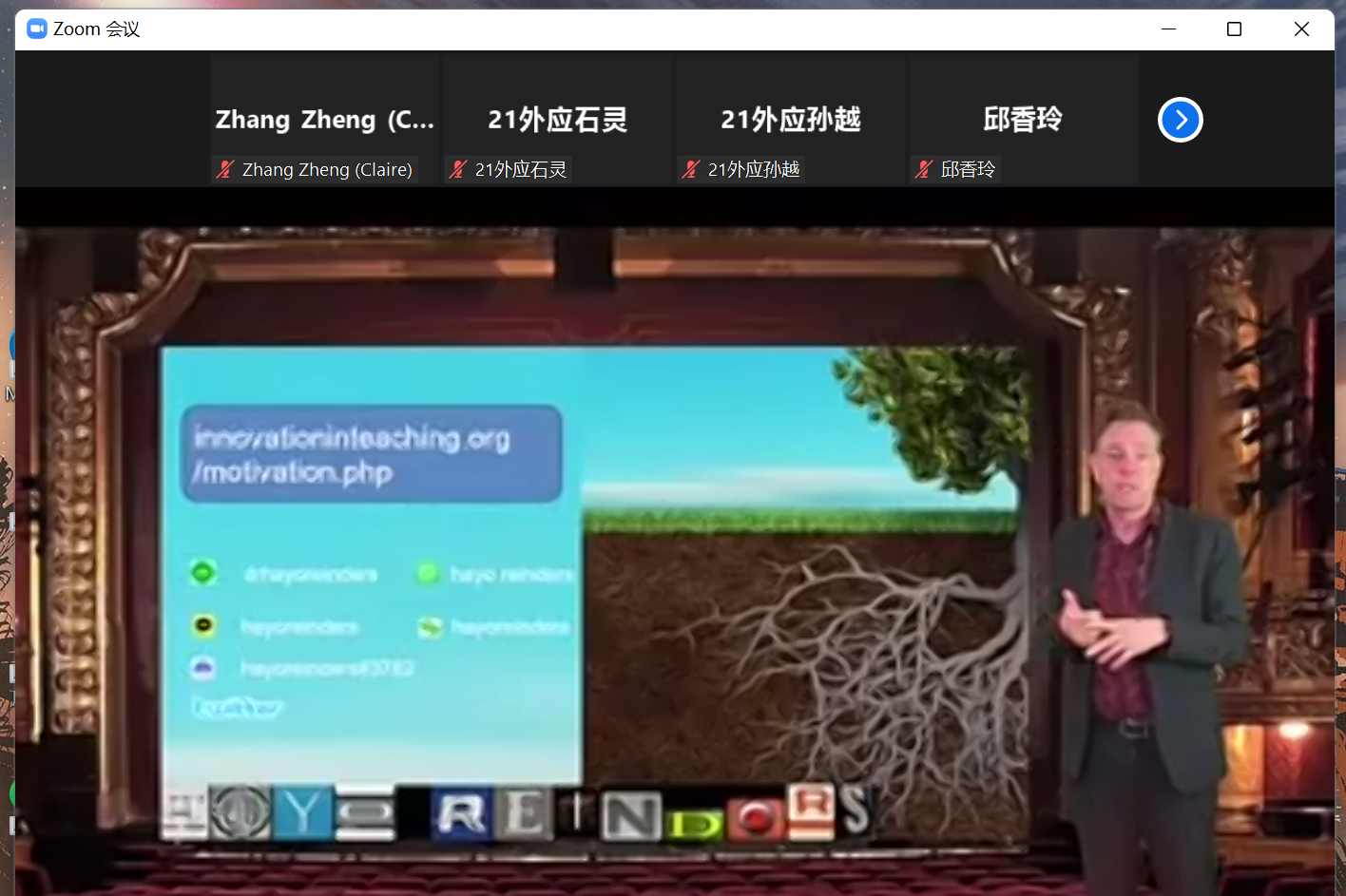 当日下午14:00-15:40,Hayo Reinders教授又为我院师生带来了精彩讲座。讲座由我院丁蕙教授主持。讲座主题为巧用教育技术促进学生学习(Using TECHNOLOGY to MOTIVATE),是Hayo Reinders教授三场系列讲座中的第一场。在这场讲座中,Hayo Reinders教授就当前信息时代、后疫情时代变化的教学环境入手,指出当前时代隐藏着给学习者和教师的发展机会。教学工具的创新和利用,将进一步促进教学的进行。Hayo Reinders教授总结了三十年来的在线学习、线上线下结合的学习模式等利用现代科技手段进行创新的学习模式,分享了如何将教学中的不利转化为有利的方法,从而在不断变化的环境之中,将潜在的危机转化为动机和契机。