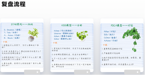 李慧学姐分享了她由私人企业到外企再到央企的三段工作经历,讲述了她作为一名英语专业毕业生如何转型为项目管理者的过程。她鼓励我们敢于跨专业,以英语为跳板,成为一名复合型人才。她建议同学们明确目标、脚踏实地,尽早为就业作准备,并向大家推荐了学习方法和资源。她还重点分享了职场感悟:第一是要主动工作,即多思考并及时汇报;第二是向上管理;第三是复盘总结,即善于归纳分析和计划,并给出了复盘流程图: