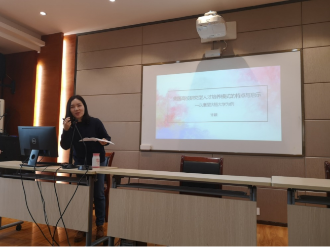许颖老师以赴美访学交流的亲身经历为切入点,做了题为《美国高校研究型人才培养模式的特点与启示——以康涅狄格大学为例》的讲座,从课堂、院系、学术氛围和导师四个方面介绍了康涅狄格大学如何培养研究型人才。她认为,该大学多样化的课堂规模构成、开展形式和考核方式让课程学习更高效;跨学科合作和各院系丰富多彩的报告让研究迸发无尽活力;跨学院、跨高校及跨地区的学术交流营造出浓厚的学术氛围;真心热爱学术的导师,怀着超乎寻常的耐心和热情指导每一位求知的年轻科研者。许老师通过大量鲜活的事例,直观地再现了中美高等教育的异同并指出他山之石可以攻玉。全国教育大会以来,党中央国务院围绕高等教育进行了一系列高瞻远瞩的布置,教育评价制度的改革将为中国高等教育激发活力、增加动力,中国的高等教育在新时代的蓬勃发展逐渐已成燎原之势。