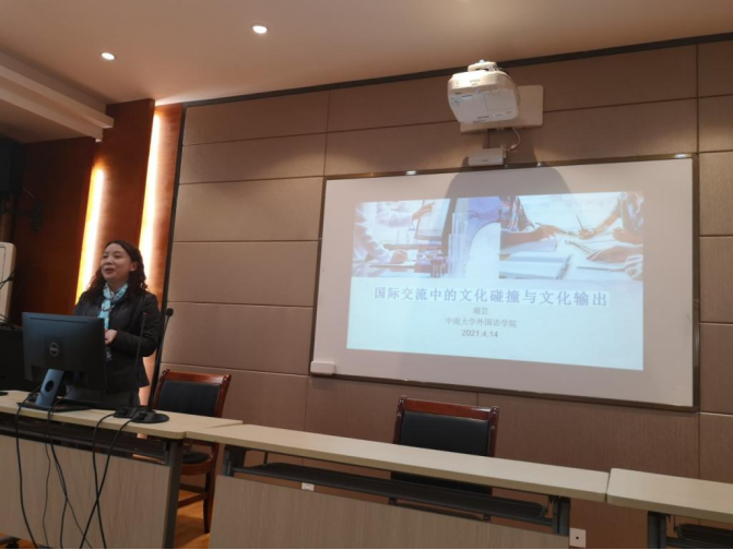 谢芸老师根据多年国际合作与交流的工作经验,做了《国际交流中的文化碰撞与文化传播》的分享。她列举了十多年工作中与美国、亚非拉第三世界国家各种团体和高校交流过程中的特色事例,分析了在与西方发达国家和第三世界国家交流过程中,随着中国国力的增强,双方交流方式的改变,以及交流过程中中国文化逐渐获得优势的局面。谢芸老师在分享结束时得出结论:有效的国际文化传播探索刻不容缓,大学英语老师理应站在第一线,做好教育思政、文化传播工作。