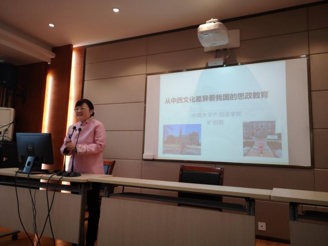 旷剑敏老师的讲座题为《从中西文化差异看我国的思政教育》。她主要从哲学的角度探寻了中西文化差异的根源和我国外语思政教育的文化根基,解答了大家一直比较困惑的几个问题:美国在抗疫中表现为何远远不及中国?我国的社会主义优越性体现在哪里?我们的文化自信从哪里来?总统选举制的实质是什么?在中国和美国,人民和政府的关系是怎样的?旷老师从哲学的高度对比了中美在政治、语言、教育、文化等方面的差异,为我国的外语思政教育带来了启示。