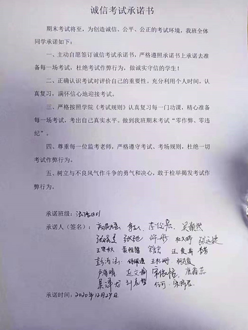随后,各班同学在《诚信考试承诺书》上签名,纷纷表示要强化诚信考试意识和自我管理意识,积极备考,共同营造公平公正、健康有序的考风考纪。