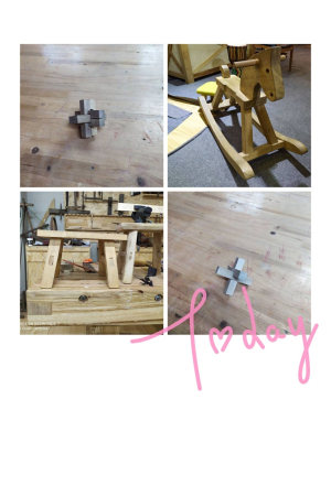 (左一照片:木工作品鲁班锁,木马及卯榫结构木凳展示)