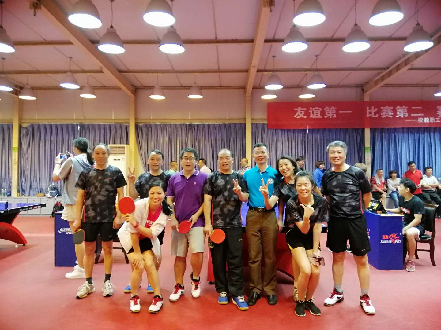 只见选手们挥拍厮杀,长抽短吊,斗智斗勇,难解难分,银球划出道道弧光,正所谓“棋逢对手,将遇良才”!经过两天角逐,外语院队一路过关夺隘,终场,男女混合队夺得全校第四名,创下了外语院乒乓球赛事历史最好成绩。本次赛事,充分展示了院工会领导和教职工会员上下同心,勇于拼搏的团队精神。在接到校工会比赛通知后,院工会立马排兵布阵,组织人马,积极备战,并请来高水平的陪练。乒乓球队平均年龄超过五十岁,且都是一线教师,工作担子重,但都能克服困难,召之即来,来之则战。在备战中,工会文体委员邓煜和易扬委员,身先士卒,既是指挥员又是运动员。每一场比赛都少不了莫友元教授的亲力亲为,精心统筹,当有运动员因病不能参战的紧急关头,黄启瑜老师临危受命,奋斗迎战;杨建丽老师患有膝盖滑膜炎,且临近退休,但精神和风采不减当年,受命上阵,充分展示了外语院的巾帼风范。