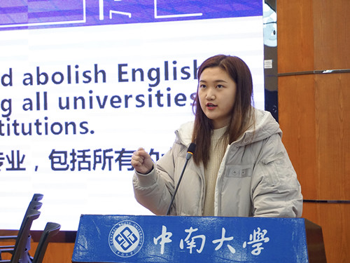比赛双方就“中国是否应废除高等教育中的英语专业,包括所有的大学,职业学院,硕士和博士研究生院”一问题展开辩论。正方认为,如今英语专业太过泛化,英语专业的学生在就业时因相应领域的专业知识和技能不足而缺乏竞争力,从而应拆分英语专业至具体学科中去;反方则认为,从英语的本质来看,它不仅是工具,更是一门艺术,而英语专业的学生能在专业老师的指导下深入了解西方文化、促进国际交流,因此不该废除高等教育中的英语专业。双方辩手你来我往、唇枪舌战,针锋相对、步步紧逼,把辩论赛一次次推向高潮。清晰的思路,巧妙的陈词,敏捷的思维,夺人的气势赢得了在场评委和观众的阵阵掌声。