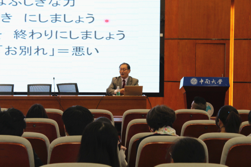 除了日语学习上的知识外,森山教授还对人际间交往的礼仪问题进行了阐述,并提及了一些交际场合的礼貌用语。在姿态、问候、衣着、宴会、礼物等方面上,他详细叙述应该注意的问题,并向大家普及一些适合这些交际情景的礼貌交际用语。例如,不管是坐在椅子上还是塌塌米上,晚辈都不能在长辈面前盘腿而坐;本国不能容忍在公共场合哄然大笑,因此在笑时声音要尽量放低;在谈话开始时就要面带微笑,并将笑容保持很长一段时间等等。讲授过程中,同学们在互动环节积极响应,纷纷根据自己在日语学习上的疑惑提出问题,并勇于抒发自己的见解。森山教授始终带着和蔼的笑容,与大家愉快地进行的交流和研讨。