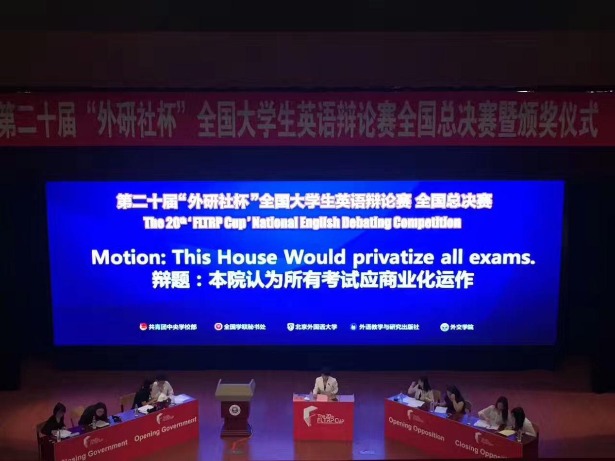 “外研社杯”全国英语辩论赛创始于1997年,是目前国内规模最大、水平最高的英语口语辩论赛事。比赛由团中央学校部、全国学联秘书处、北京外国语大学主办,外语教学与研究出版社承办,中国教育电视台、中国国际广播电台、英语学习杂志社协办。在今年的比赛中,清华大学、北京大学、中国人民大学、复旦大学、北京外国语大学、上海外国语大学、浙江大学、北京航空航天大学、上海财经大学、中央财经大学等全国120支知名高校代表队进入全国总决赛。