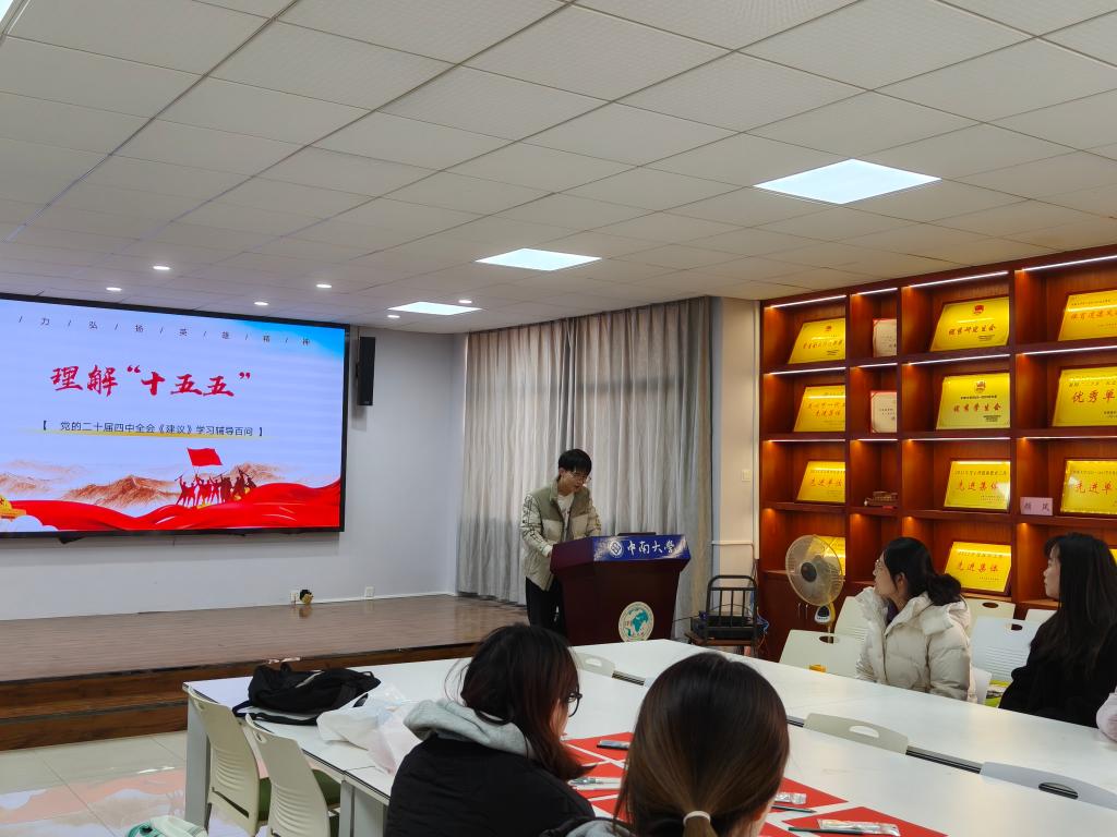 活动开始,支部组织委员李煜锋首先领学《中共中央关于制定国民经济和社会发展第十五个五年规划的建议》,解读“十五五”时期经济社会发展的指导思想、主要目标与重大举措。李煜锋同志从三个维度展开阐述:一是深入剖析“十五五”时期经济社会发展要坚持党的全面领导、坚持人民至上、坚持高质量发展等重大原则;二是结合全球变局与“三难三新”的国内外挑战,指出在科技战、规则战、安全战交织的背景下,外语人才在“提升国家文化软实力”战略布局中肩负特殊使命,既要为中国方案的国际传播搭建桥梁,也要在文明互鉴中坚守文化主体性;三是引导党员立足学习本职,将个人成长规划与国家发展需求同频共振。领学内容既有政策的精准把握,又有贴合青年党员实际的思考视角,帮助大家从宏观战略中找到微观落脚点,进一步明晰了新时代外语学子的责任与方向。