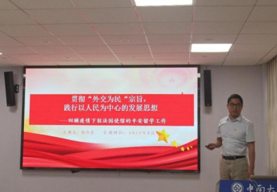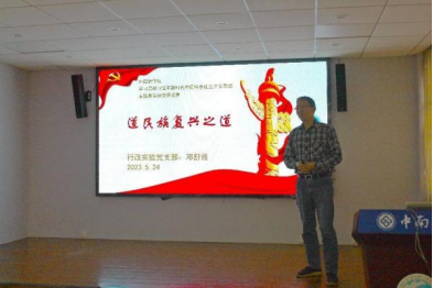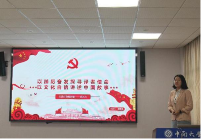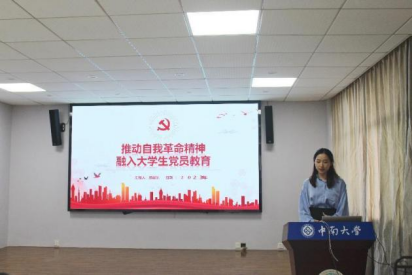 学生党员则从如何当好中南外语人及讲好中国故事展开论述。本科生小语种党支部的蒋馨逸同学以红色翻译家郭大力先生为例,强调作为新时代中南外语人要坚定文化自信,以踔厉奋发的精神,勇于担当,讲好中国故事。研究生第三党支部的施晨旭同学紧扣自我革命精神,从自我净化、自我完善、自我革新、自我提高四个方面展开论述,情感真切,理解深刻。