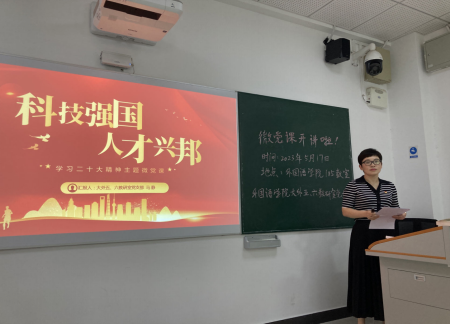 5月17日下午,大外五、六教研室党支部全体党员早早来到南楼105教室,举行了第一轮微党课展示。本轮微党课的主题为“推进主题教育走深走实”,段慧如、李瑶、王箐、曾丹、马静等五位同志围绕“习近平新时代中国特色社会主义思想世界观和方法论”,分别从“实践依据”“科学内涵”“丰富发展”等角度进行了解读,并就“区域重大战略和区域协调发展战略”“科技强国、人才兴邦”等主题分享了自己的理解。微党课突出了党性,弘扬了主旋律,既有时代性,又有针对性。各位主讲人资料收集丰富,理论联系实际,教案逻辑严密,具有极强的感召力。