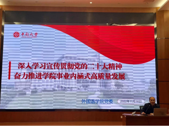 陈广程书记做了题为“深入学习宣传贯彻党的二十大精神, 奋力推进学院事业内涵式高质量发展”的宣讲,从党的二十大召开的总体情况、主要精神、贯彻落实党的二十大精神有关具体要求三个方面展开阐述,提出要重点突出学,要系统推进学习培训,要广泛开展宣讲活动,要有机融入教育教学,要深入开展研究阐释,期望全院教职工共同认真落实党的二十大提出的任务要求,以更宽广的视野深化认识初心使命,以更高远的眼界思考谋划未来发展,以更高标准、更大力度推动学院各项工作。