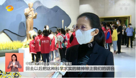大外五、六教研室党支部的“粮食安全”主题党日活动吸引了湖南卫视等媒体记者的注意,记者全程拍摄了支部党员们排队向袁隆平院士塑像敬献菊花、深切缅怀的场景,采访了支部书记段慧如教授,并在当天的午间新闻和湖南新闻联播播出。在接受采访的过程中,段慧如书记表示:在这个特殊的日子里,我们来到这里了解袁隆平院士的丰功伟绩,回去以后把这种科学求实的精神带上我们的讲台,为党育人、为国育才。
