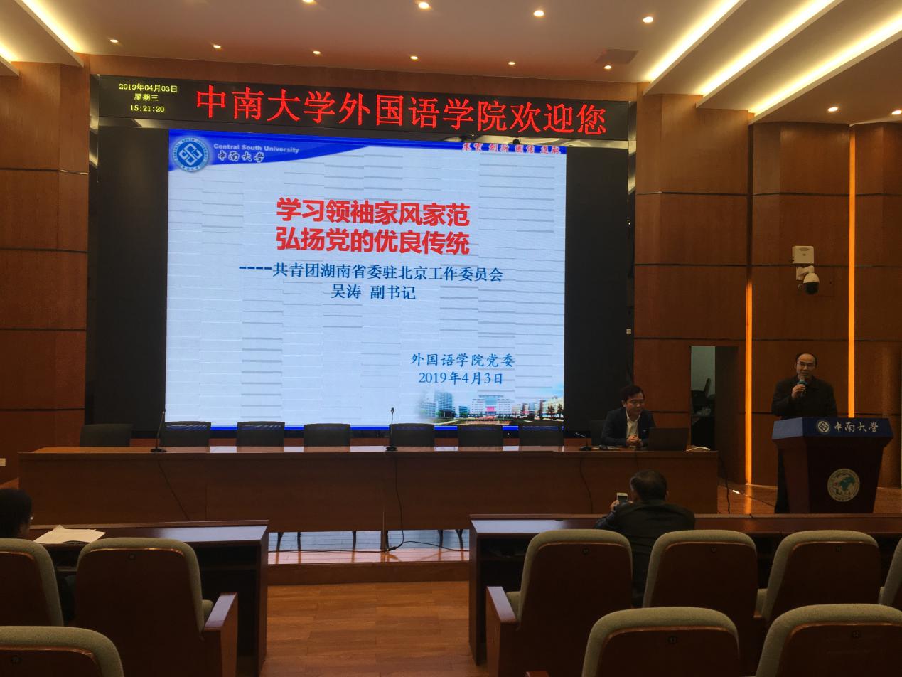 (通讯员:罗雪)为深入开展“不忘初心 牢记使命”主题教育,4月3日下午学院党委举办了“不忘初心使命,传承领袖家风”主题党课教育,旨在使全体党员牢记党的初心与使命,学习传承领袖家风家风、弘扬党的优良传统作风,规范自身行为。学院全体党员同志于在外语楼一楼报告厅进行集体党课学习。本次党课由湖南省第十一届青联常委、共青团湖南省委驻北京市工作委员会副书记、共青团北京市委团员青年党史教育项目主管吴涛同志担任主讲人。学院党委书记陈广程同志主持了党课学习。