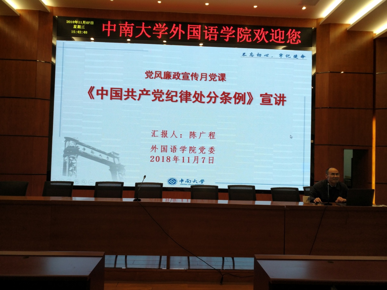 为落实好党委党风廉政宣传月活动安排,下午3:30,学院党委召开全体党员大会,以党课形式宣讲、解读《中国共产党纪律处分条例》。