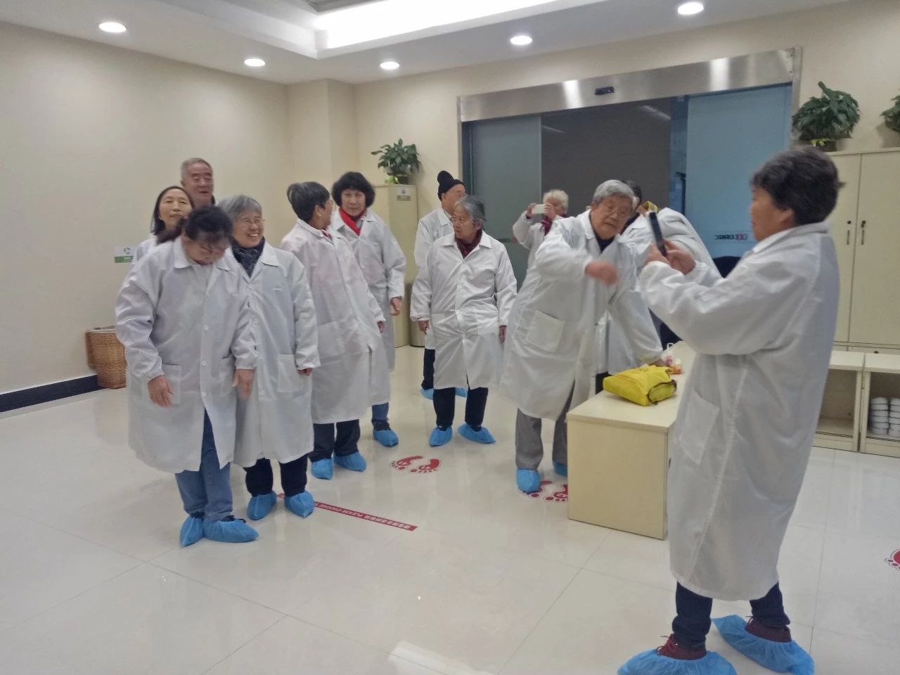 了解完中国机车的历史与未来,接下来老党员们一起参观了中车半导体事业部,了解了先进机车IGBT技术。IGBT技术生产部对于环境要求很高,老党员集体换上防尘服,套上鞋套。
