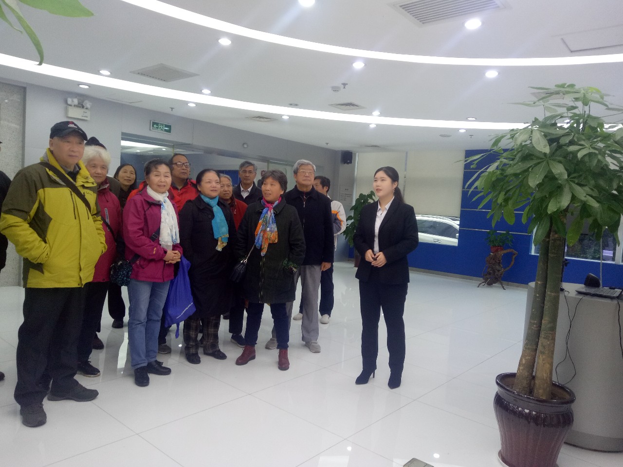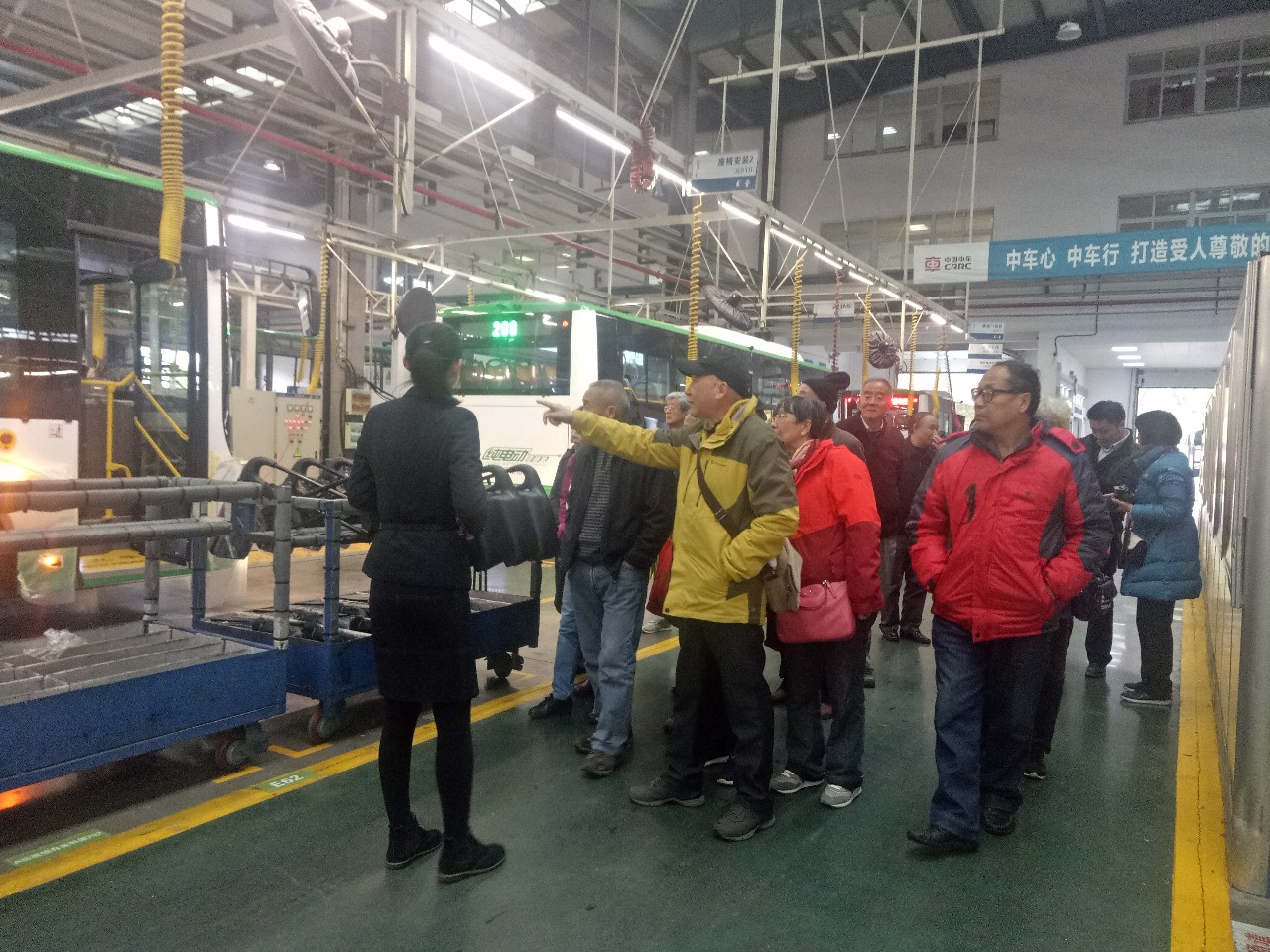 参观公交车生产基地,老党员们认真聆听讲解员讲述公交车的生产全过程。