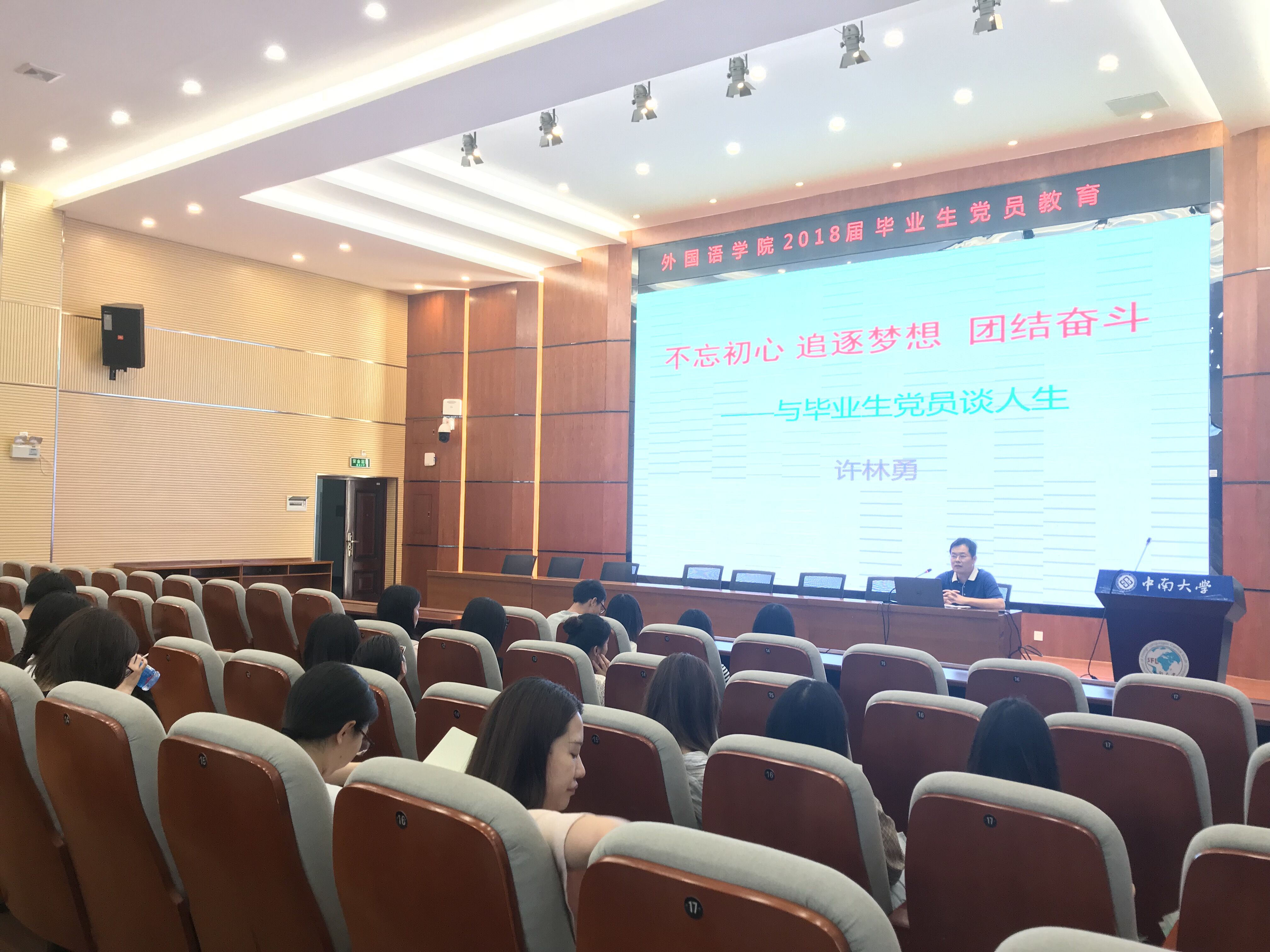 6月7日下午,学院党委许林勇副书记以“不忘初心·追逐梦想·团结奋斗”为主题的讲座开始了此次培训。他从2018年全国高考题目作为切入点,向毕业生党员强调关心政治、了解党的相关知识是学习进步的内在要求。他还提到,习近平总书记在北京大学师生座谈会上的讲话应当引起毕业生党员的重视。习近平总书记在座谈会上指出,“广大青年生逢其时,也重任在肩。”这与本次座谈会的主题不谋而合。许书记寄希望于毕业生党员,叮嘱他们要不忘初心,勇于追梦。