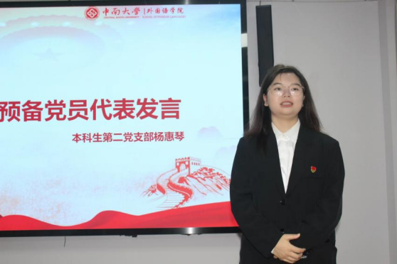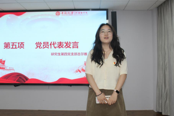 大会第五项,研究生第四党支部的古尔雅同志作为正式党员代表发言。她首先对大家加入党组织表示了热烈欢迎,接着通过分享自己参与志愿服务的亲身经历,强调了党员要自觉在思想上、政治上、行动上同党中央保持高度一致,在实践中勇担重任,用青春书写时代新篇章。
