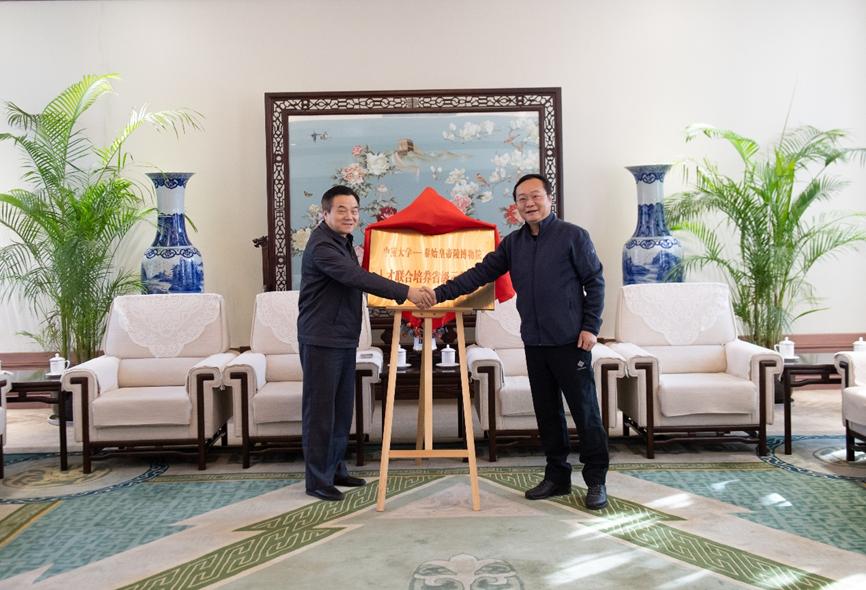 2023年11月17日, yl9193永利YL集团党委书记李涛、副院长仲文明、鄢宏福,英语系党支部书记陈洁、英语系教师王晓东、郭薇、田莎一行七人一行七人来到秦始皇帝陵博物院,就进一步深化馆校合作和人才培养事宜开展互动交流,并为“yl9193永利集团—秦始皇帝陵博物院人才联合培养省级示范基地”揭牌。秦始皇帝陵博物院党委书记、院长李岗,党委副书记、副院长田静及社会教育部、党政办公室相关人员参加活动。
