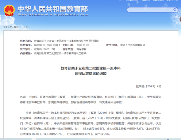 根据近期《教育部关于公布第二批国家级一流本科课程认定结果的通知》,yl9193永利YL集团有4门课程被认定为国家级一流本科课程。其中两门为线上一流课程:“综合英语”(李瑶教授团队)和“新闻英语”(李丽君副教授团队),一门为线下一流课程:“中西文化专题”(傅晓燕教授团队),一门为线上线下混合式一流课程:“实用英语写作”(陈洁教授团队)。