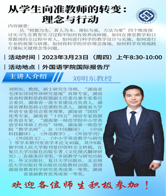 2023年3月23日(周四)上午,应学院邀请,“湖南省毛泽东诗词外译研究基地”首席专家、湖南省高校课程思政联盟副主任委员兼专家委员会委员、湖南第一师范学院刘明东教授在国际报告厅带来一场题为“从学生向准教师的转变:理念与行动”的精彩讲座。讲座由英语系主任李玲教授主持,我院多名师生参会。