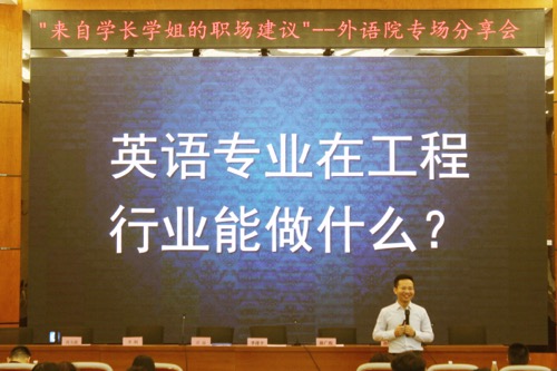 最后为大家分享经验的是2013届毕业生高玉鑫,现任国家移民局长沙出入境边防检查站边防检查员。谈起自己的工作,他满腹情怀,服务于人民群众,为国家安全保障、社会经济发展做出贡献,他号召同学们要对自己的职业保有情怀,做自己热爱的事。他更提到要时常自我鞭策并感激他人的鞭策。谈到语言专业就业问题,他介绍了几位同届同学们的从业方向,如跨专业考研、从业于中外合资企业、参军等,为在座的同学们提供了指导。