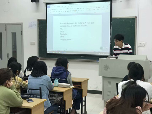 西语1601班的郑建、苏灵晗为西语1701班的同学从专四考试各类题型的角度分享经验,依次介绍了自己的备考方法和应试技巧。他们重点论述了阅读的重要性,同时强调了心态在考试期间所起的关键作用,并推荐了实用的手机软件及外文网站。在问答环节,两位主讲人和班导师对同学们的疑惑进行了耐心而细致的解答,既有方法的指导,也有信心的鼓舞。