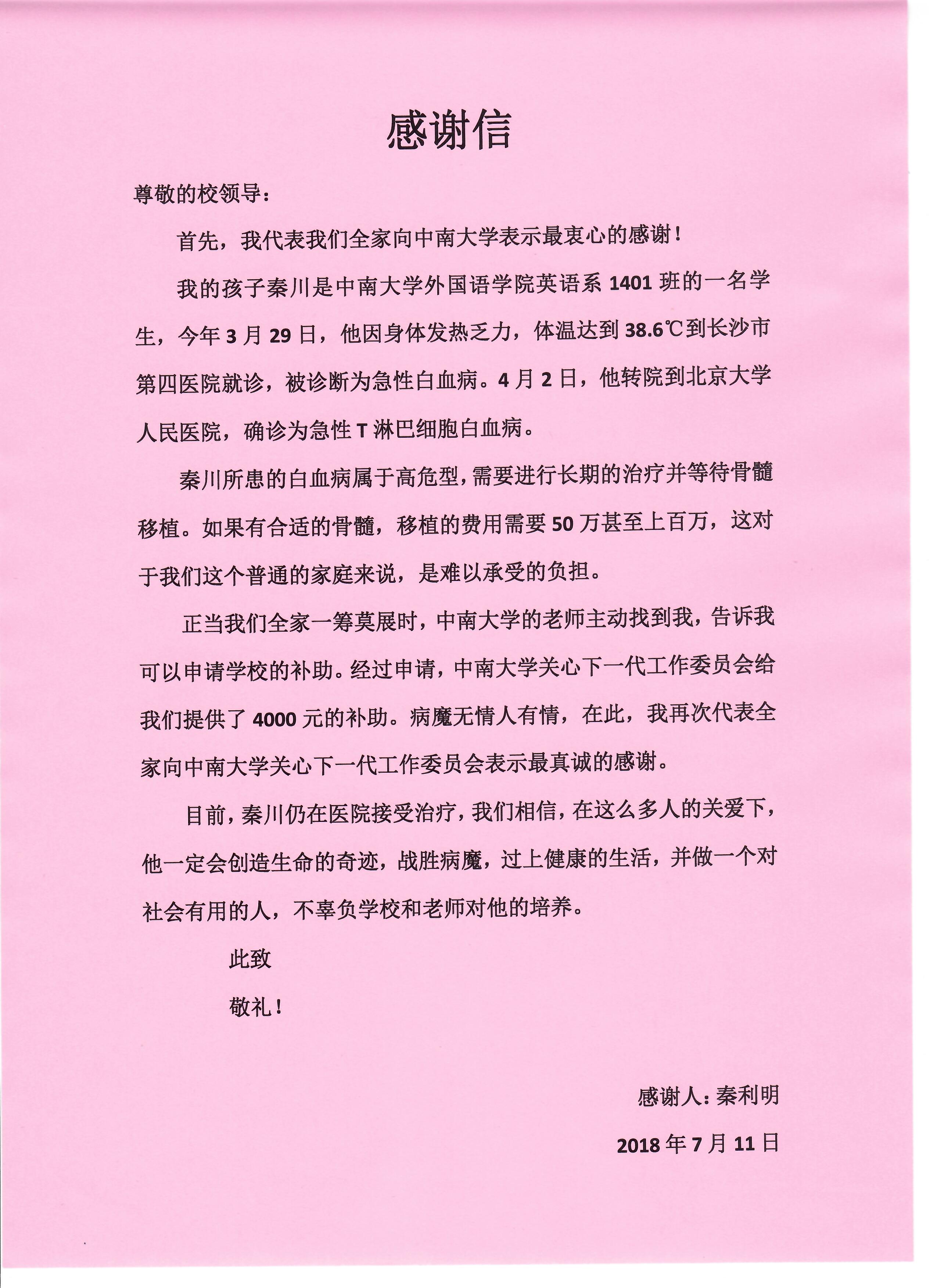目前秦川同学仍然在北京接受治疗,他的家长给学校和学院发来了感谢信,感谢大家对秦川同学的关心和帮助。我们也希望秦川同学能够战胜病魔,早日康复。