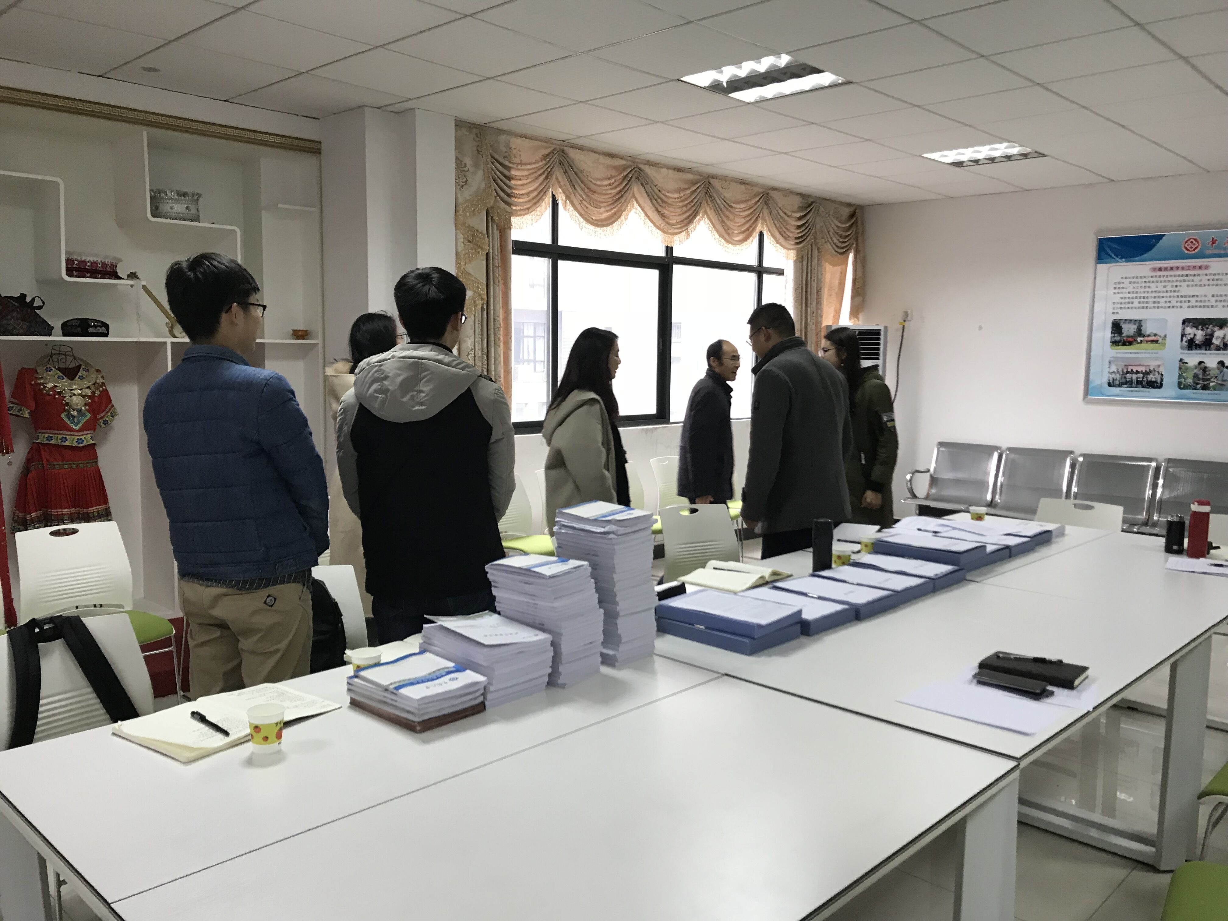 2018年1月16日下午学工部徐赞副部长、屈湘南老师、向美玲老师及土木院赖梓辰、资安院肖陆伟和商学院邓志诚三位18届本科留校辅导员一行六人来院检查和指导学生工作。会议于学院326民族团结教育室进行。