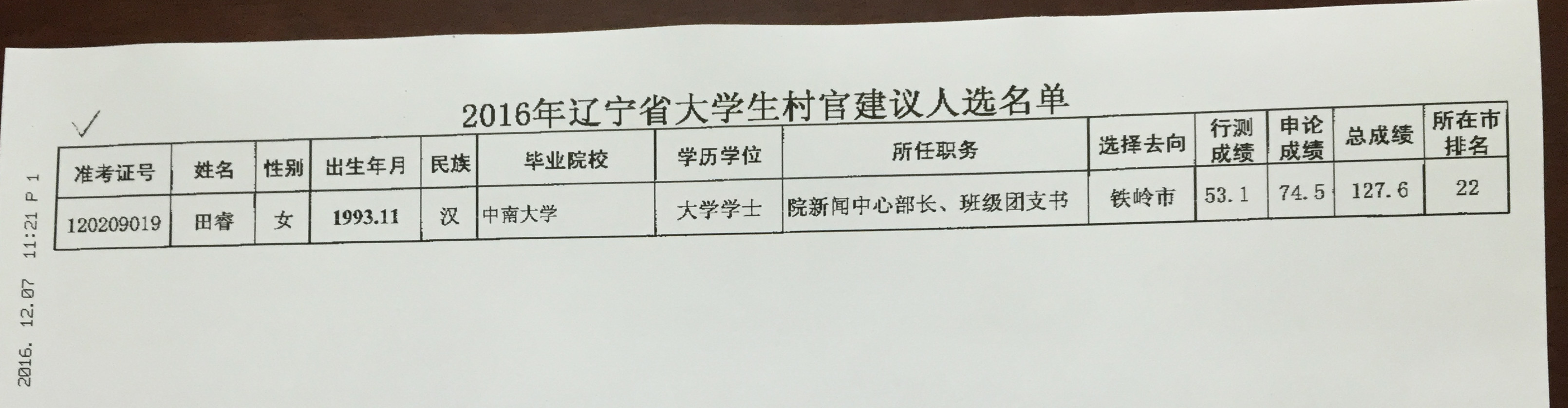 2016年辽宁省大学生村官建议人选名单公示