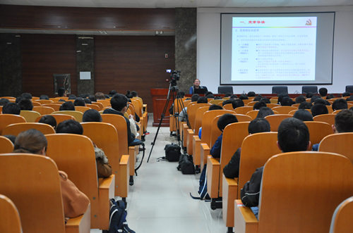 会议开始,所有在席人员齐唱国歌,重温入党誓词。随后,党校的唐建华教授辅导预备党员学习十八大党章。唐教授向大家介绍了党章发展的历史,强调了遵从党章、增强党章意识、加强党性修养的重要性。他还以社会上先进党员的事例为榜样,鼓励大家早日成为合格的共产党人。唐教授的精彩讲话之后,机电院和建艺院的两位优秀党员代表现身说法,向预备党员学员分享了自己加入共产党和为党组织服务的经历,提醒大家在今后的道路上要提升个人素质,努力学习党章党规。最后,在充满激情,庄严肃穆的国际歌歌声中主持人宣布会议结束。