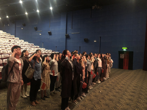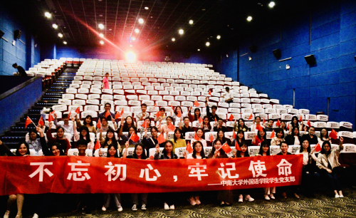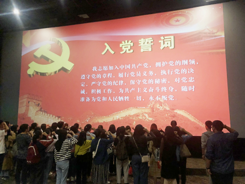 观影时,大家情随景移,心中充满了赞叹,伤感处也泪光闪闪。情到深处,激动之时,大家跟电影中一样,挥动着手里配发的五星红旗。观影结束后,很多同学依旧热情难平、感慨万千。离场前,全体党员合影留念,大家一起重温入党誓词,进行集体宣誓,