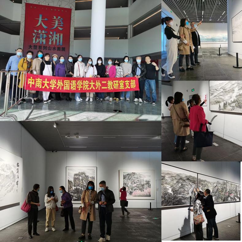 下午一点老师们集体坐车赶往湖南省美术馆,首先观看了由湖南省委宣传部指导、湖南省文学艺术界联合会主办的“大美潇湘”大型系列山水画展。据讲解员介绍,本次画展创作由王金石领衔、50多位艺术家合作,按照一江一湖三山四水的布局,形成6大系列,推出7幅长卷作品、33幅单幅作品,铺开了一幅湖湘几千年的文化全景长卷,生动展现了新时代潇湘的精神风貌。其中,《大江交响》《天下洞庭》《湘江北去》《资润江山》《沅水奔流韵潇湘》《澧水泱泱》《多彩浏阳河》等7幅大型山水画被誉为新时代“潇湘七卷图”。有意思的是,观展过程中老师们都在寻找描绘自己家乡的作品并与其合影,以这种方式来表达对故乡的思念之情。经过画作观赏和小组讨论后,老师们一致认为,“大美潇湘”画展充分表达了“人民对美好生活的向往”时代命题,具有湖湘特色、充满文化底蕴,此次观展是对艺术和思想的双重熏陶。