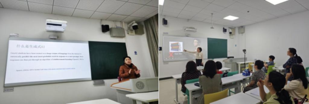 2024年11月13日,大外中心第三教研室组织教师们参加教发中心定制的“AI赋能课堂教学的探索与实践”专题讲座,并在会后开展了“生成式AI助力大学英语教师专业成长”专题研讨。教师们围绕生成式AI在大学英语教学中的应用及提升教师专业能力等方面展开深入交流,主要探讨了人工智能丰富教学资源、创新教学理念的多种可能以及利用技术设计个性化教学方案、提升教学效率等具体实施路径。与会教师们达成共识,应积极主动探索AI在教学中的多元应用,持续提升信息素养与教学能力,以科学合理的方式将其融入教学流程,为学生塑造更优质、高效且个性化的学习体验,为教育数字化革新持续赋能,全方位助力大学英语教学革新与发展。
