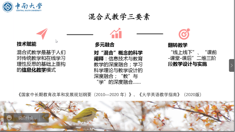 来自英语系获得2022年校本科教学成果二等奖、省级一流本科课程“实用英语写作”负责人陈洁老师做了题为“2022年校级教学成果奖申报总结与反思”的分享。陈老师首先明确了混合式教学的定义,介绍了混合式教学三要素,即技术赋能、多元融合、翻转教学。并通过对三要素内涵的进一步介绍,阐述了如何做好混合式教学。在具体介绍技术赋能”涵义时,陈老师分享了自己的信息化教学能力成长历程,详细阐述了教师需具备的信息化技术与能力,如微课设计与制作、高质量PPT制作、在线课程建设与应用、以及如何借用在线课程开展“混合+翻转”教学。在阐释“多元融合”概念的过程中,陈老师强调要注重学习科学理论与教学设计的深度融合以及“教”与“学”的深度融合。陈老师强调“翻转≠放任课堂”,并通过对翻转教学流程示意图的展示和分享,揭示了教师在翻转课堂中应起到“时空衔接者”和“全程参与者” 的作用。陈老师基于自身的经验和体会,对专业教师开展教研教改提出了自己的思考和建议:全力抓好专业教学“新基建”,抓专业、抓课程、抓教材、抓学习技术方法、抓教师发展;要以培养方案修订为契机,发挥集团作战优势,组织申报教改群项目,进而建设优质专业课程群;专业课教师要把教学学术研究与科研学术研究结合起来,加大教师之间的深度合作,实现互利共赢;眼界放大些,思路开阔点,做专业教学与公共教学贯通的、打破专业或院系边界的“融通型”研究。最后,陈老师还分享了课程思政建设研究的经历和收获。