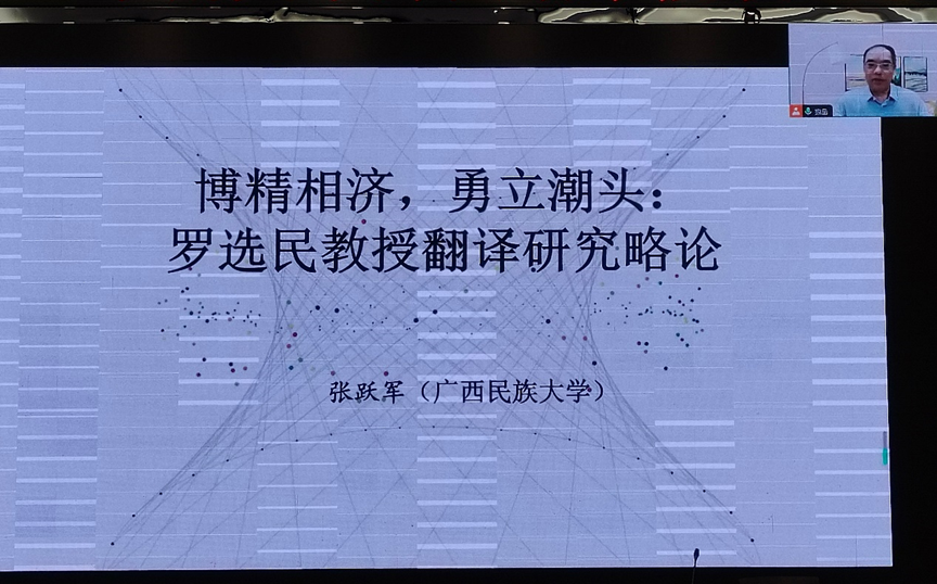 广西民族大学yl9193永利YL集团张跃军教授以“博精相济,勇立潮头:罗选民教授翻译研究略论”为题作报告。张跃军将罗选民教授的研究分为语言学、文学文论、教育教改、书法美学、书评等类别,并进一步将其翻译研究根据研究对象分为翻译单位、翻译标准、文学翻译、典籍翻译、翻译教学、翻译家、翻译理论类。他通过梳理研究成果,高度肯定了罗教授的研究成就和理论贡献,对“大翻译”理论体系的持续发展表示殷切期盼。