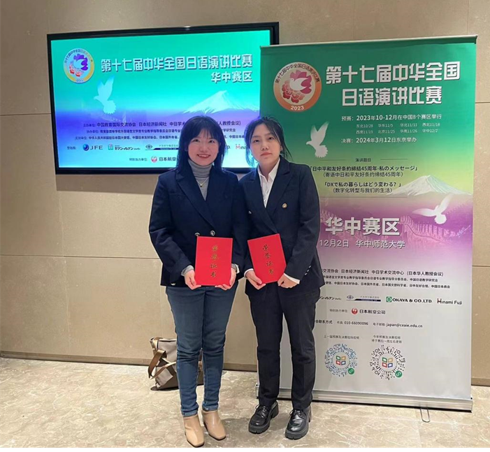 2023年12月2日,第17届中华全国日语演讲比赛(华中赛区预选赛)在华中师范大学成功举办,日语专业2020级沈慧萍同学代表我校参赛并获一等奖。日语系方颖琳老师获得优秀指导教师奖。选手沈慧萍(右)与驻中华人民共和国日本国大使馆新闻文化中心二等秘书樱井真一(左)合影中华全国日语演讲比赛是国内规格最高的日语演讲比赛之一,自2006年举办首届比赛以来,迄今已经成功举办十七届。第二届、第三届、第七届、第十二届、第十三届...