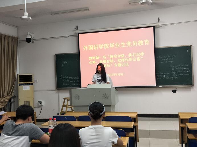 6月8日,yl9193永利YL集团全体毕业生党员于外语网络楼604教室开展了主题为“如何做一名‘政治合格、执行纪律合格、品德合格、发挥作用合格’党员”的专题讨论,讨论会由王海洋老师主持。